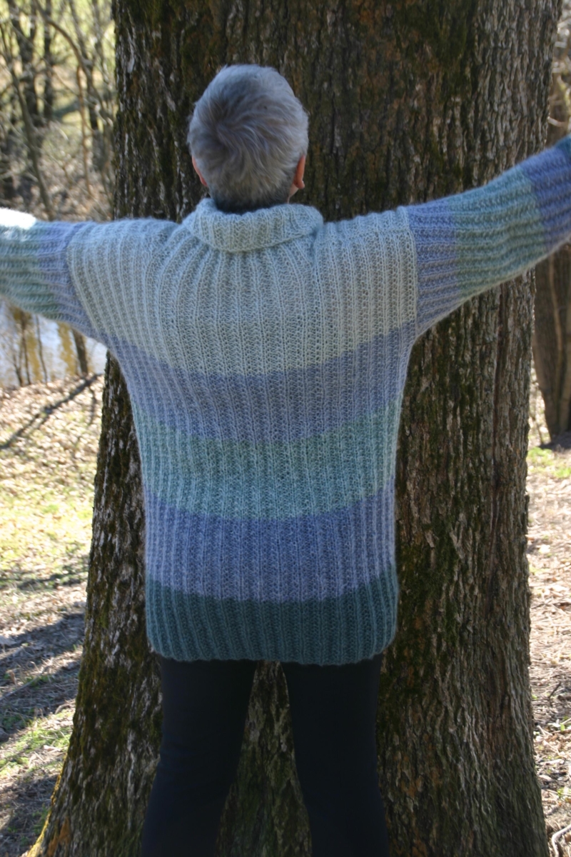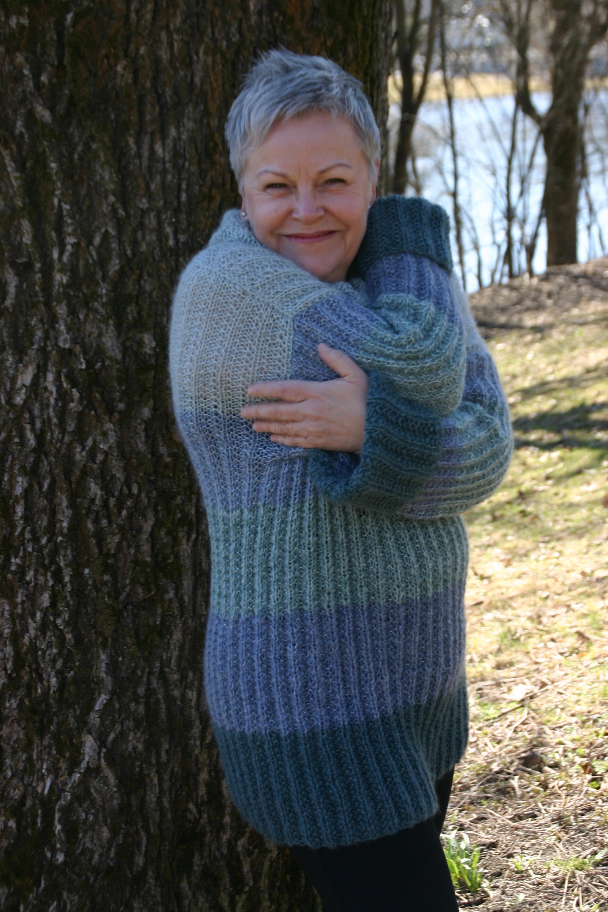 SILKEMYK trenger heller ikke den helt store konsentrasjonen. Den er strikket med 2 rette og 2 vrange på første omgang, men hvor du forskyver én maske på den andre omgangen, slik jeg har gjort på STJERNESMELL. Det vil si at du begynner omgangen med 1 rett, fortsetter med 2 vrange og 2 rette, og avslutter med 1 rett. Så gjentar du disse to omgangene hele veien. Det kalles ujevn vrangbord. Modellen er enkel å strikke. Jeg har brukt én tråd med Silk Mohair og én tråd Alpakka Silke, begge fra Sandnes garn. Og den blir helt silkemyk, derav navnet. En skikkelig kosegenser for kjølige dager. Og vi vet jo at de kommer.